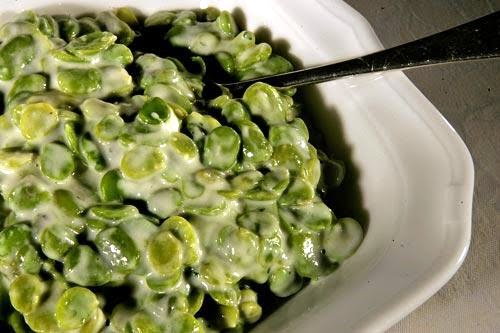 5. Stir the peeled fava beans into the cream sauce. Heat 1 to 2 minutes just until the fava beans are hot. Season to taste with salt and pepper.