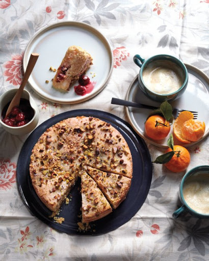 Preheat oven to 350 degrees. Coat an 8-inch springform pan with cooking spray. Line bottom with parchment; spray parchment. Mix together ricotta, confectioners' sugar, yolks, salt, zest, cherries, and anise in a bowl.