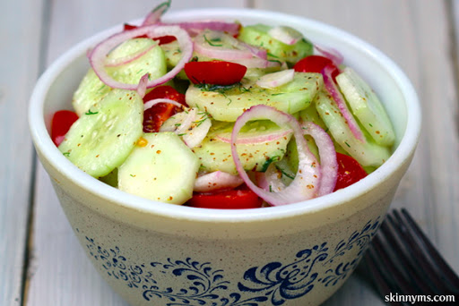 In a large salad bowl combine cucumbers, tomatoes and onion. Whisk together the remaining ingredients and pour over cucumber mix, toss to coat. Serve immediately.
