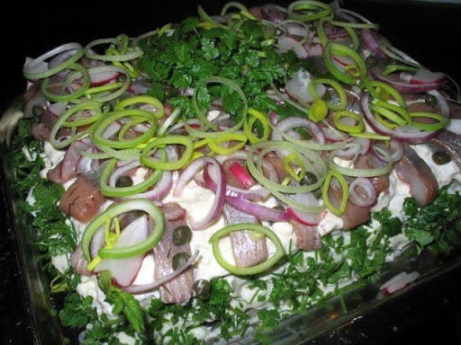 4. Garnera tårtan med sill i bitar, körvel, rödlök- och purjoringar, rädisor och kapris.