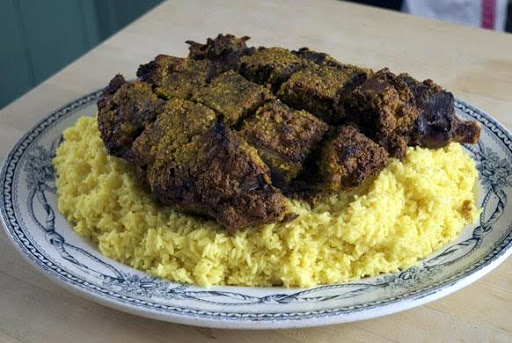While the meat is resting cook up a good kilo of rice, long grain or Basmati, with another large pinch of saffron. After draining, stir in some pomegranate seeds, pistachios and chopped fresh coriander. Food grade gold leaf is a ridiculous and marginally offensive luxury in such straightened times. I'll post the address of a supplier if anyone has the banker's chutzpah to ask.