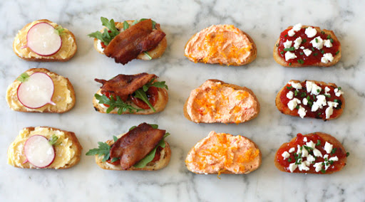 3. Make the Baby BLT Crostini: In a small bowl, whisk the mayonnaise with the black pepper to combine. Spread 1½ teaspoons onto each crostini and top with 2 pieces of sun-dried tomato. In a small bowl, toss the arugula with the olive oil, then place 1 to 2 tablespoons of dressed arugula on top of the tomatoes. Finish with a piece of bacon.