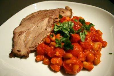 Hetta upp olivolja i en kastrull. Lägg i vitlöken, och fräs den helt kort, och mycket försiktigt. Häll över coctailtomaterna och lägg i lagerbladet. Krydda med salt, svartpepppar och råsocker efter smak. Låt tomaterna koka ihop på medelvärme i cirka tio minuter. Häll sedan i de sköljda bönorna. Låt dem koka med i några minuter.