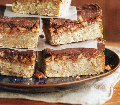 5. Bake until praline layer is set, approximately 35 minutes. Immediately sprinkle chocolate morsels ouer praline layer, and let melt. Using an offset spatula, spread melted chocolate euenly ouer praline layer. Let cool to room temperature before cutting.