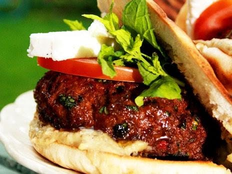 9. Fyll bröden med baba ganoush, lammburgare, skivad tomat och fetaost och plockade myntablad.
