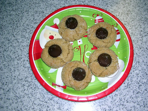 A light sugared peanut butter cookie with a chocolate kiss in the middle.