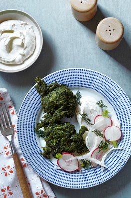 Smear feta spread onto each plate. Place 2-3 fritters and some fennel-radish salad alongside. Garnish with dill sprigs.