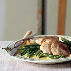 5. Slice the chicken thinly on an angle. To serve, mound the polenta in shallow bowls or onto plates and top with the green beans and chicken. Drizzle the orange-balsamic sauce on top.