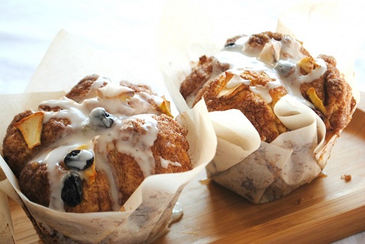In small bowl, mix together raisins with apples. Place a tablespoon of filling onto dough balls. Repeat making dough balls by adding 4 balls to the top of each muffin. Again, sprinkle with 1 tablespoon of raisin/apple filling. When all muffins are ready, bake in a 350°F. for about 25 minutes.