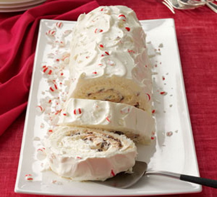 With angel food cake, fudge sauce and peppermints, this cake roll is easy and pretty. —Suellen Calhoun, Des Moines, Iowa