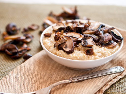 Once your risotto is cooked through (taste it to verify that the quinoa is cooked), turn heat to low and add the cheese, cream and salt and pepper to taste. Risotto should be soft and wet, not dry like typical quinoa. It should be firm enough to be served as a side on a plate, but soft enough to giggle when the plate is shaken. Stir in the mushrooms just before serving.