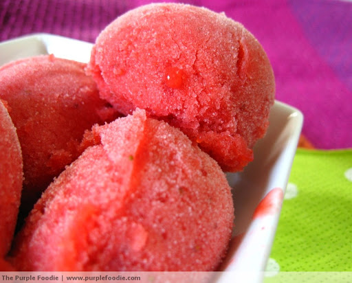 This is a light, but intensely flavored sorbet that is very refreshing when the weather is hot. (Cooking time = freezing time & is approximate.)