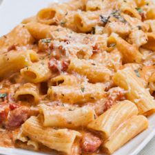 In a large skillet, cook the bacon over medium heat for 5 minutes. Add the onion, celery, bell pepper, and garlic and cook until the veggies are softened about 7 minutes. Push to one side of the skillet. Increase the heat to high and add the ground beef and cook for about 7 minutes, breaking up clumps, until cooked through.