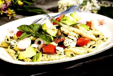 Att variera din pastasallad är enkelt. Här används fetaost och avocado.