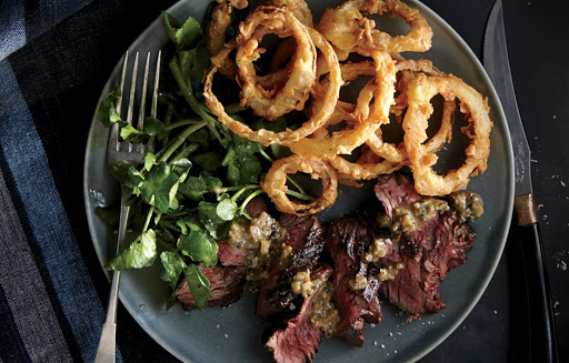 Toss watercress with reserved vinaigrette. Thinly slice steak against the grain. Serve steak with sauce, watercress, and onion rings.