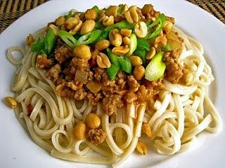 Caliente el aceite en el wok y saltee la guindilla y la pimienta. A continuación, añada la carne y remueva bien. Cuando la carne cambie de color, agregue la salsa de soja y siga salteándola hasta que esté bien dorada. Mezcle con cuidado los ingredientes de la salsa y viértala en 4 boles. Cueza los fideos según las instrucciones del envase; escúrralos y repártalos entre los boles. Disponga encima la mezcla de carne, esparza por encima los cacahuetes y sirva el plato. Mezcle bien los ingredientes antes de comerlos.