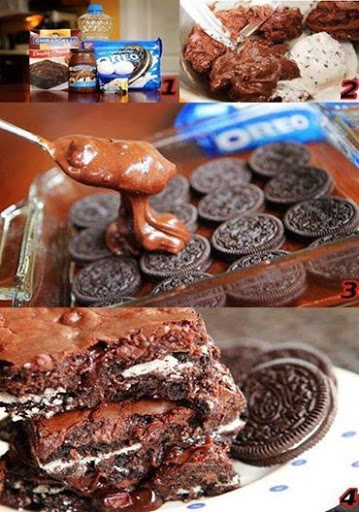 Pour half of the brownie batter into the baking dish, layer with Oreos, then top with remaining batter. Bake for 40-50 minutes or as directed on the back of the box.