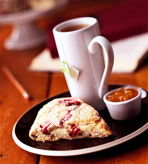 3. Place wedges about 1 inch apart on an ungreased baking sheet. Don't flatten. In a small bowl, combine egg and water. Lightly brush tops of wedges with egg mixture. Sprinkle tops with 2 tablespoons sugar. Bake in a 375 degree F for 20 to 25 minutes or until golden. Remove scones from baking sheet. Serve warm. Makes 8 scones.