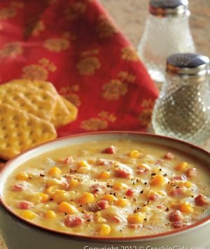 Place potatoes, both cans of corn, chicken broth, ham, and onions into the slow cooker.
