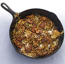 Add the remaining 1 Tbs. butter, the corn, jalapeño, garlic, and 1/2 tsp. salt. Cook, stirring, until the corn begins to brown lightly, 2 to 3 minutes. Add the chicken, lime juice, oregano, and 1/2 cup water. Cook, stirring, until the chicken is just cooked through, about 2 minutes. Sprinkle with the Cheddar and transfer the skillet to the broiler. Broil until the cheese melts and browns on top, about 3 minutes. Serve with lime wedges.