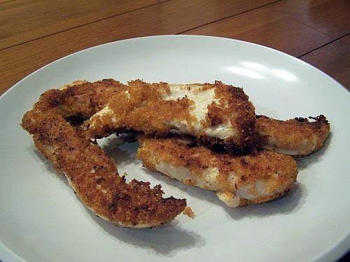 Mix together everything except the butter. Then melt the butter, and dip the chicken strips in the butter and then dip in the crumb mixture.
