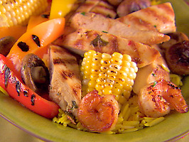 Grilled Meats and Vegetables over Saffron Orzo