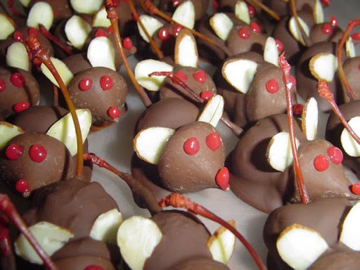 While chocolate it still gooey, “glue”on a hershey’s kiss to the mouse’s body, with the bottom of the kiss touching the cherry and the pointy part pointing out, the opposite direction that the tail is pointing.