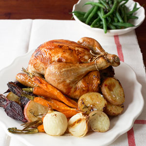 place carrots under the chicken before roasting, place potatoes around chicken before roasting