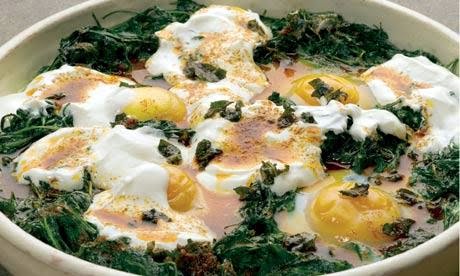 While the eggs are in the oven, mix together the yogurt and garlic along with a pinch of salt. Stir well, taste, adjust the seasoning if necessary and set aside - do not chill, however.