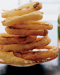 Meanwhile, in a large saucepan, heat the vegetable oil to 380°. Dip 8 onion rings in the batter, letting the excess drip back into the bowl. Fry the onion rings in the hot oil over high heat, turning occasionally, until golden and crispy, about 3 minutes. Transfer the onion rings to a paper towel-lined baking sheet and sprinkle lightly with salt. Repeat with the remaining onion rings and batter and serve hot or warm.