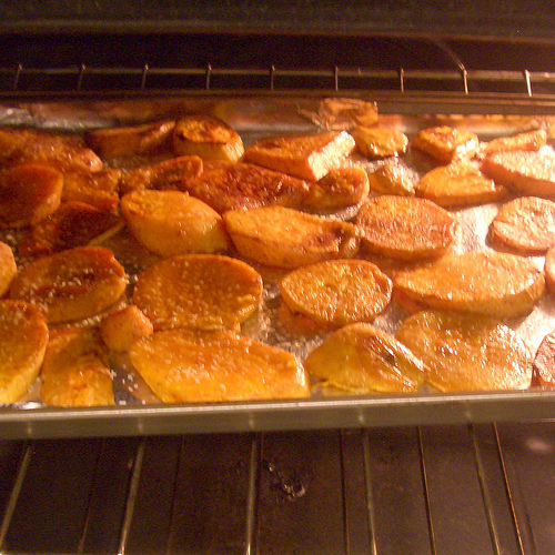 Arrange slices on baking sheets so they don’t overlap. Spray with a bit more oil and sprinkle with salt. Bake chips until they begin to lightly brown, about 15 minutes. Cool on a rack and serve. Recipe makes 4 servings.