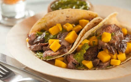 Mangoes make an appearance in both the sauce and garnish for these fajitas, adding plenty of sweet and tangy flavor. For a vegan version, substitute baked or grilled tofu for the steak.
