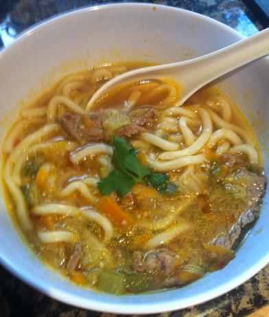1 Cut beef into very thin strips. In a bowl, combine beef with soy sauce. (I added some crushed red pepper -- love the spice). 2 In a large saucepan over high heat, bring stock, ginger and garlic to a boil. Add vermicelli; boil for 2 minutes or until softened. Add beef, carrots and cabbage. 3 Return to a boil; cook for another 2 minutes. Add bean sprouts and cook for 1 minute or until heated through. 4 Ladle into bowls; garnish with cilantro and chopped green onions. Drizzle with sesame oil, if desired.