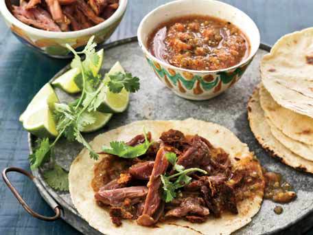 Serve on tortillas with the salsa, cracklings and cilantro.