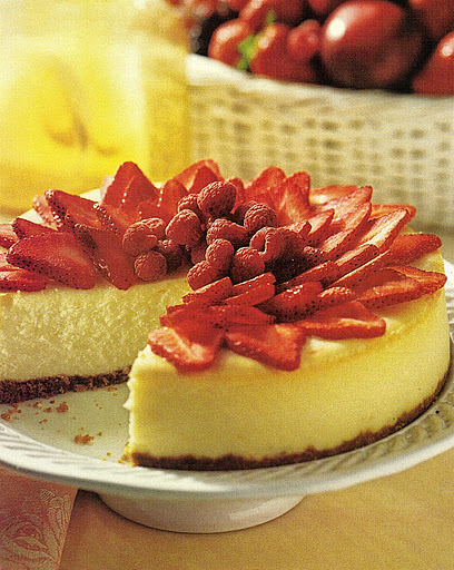 When ready to seve, remove the pan sides. Slide the cheesecake onto a serving plate. For the topping, overlap the strawberries in circles on the cheesecake. Fill the center with raspberries.