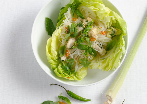 Line bowls with lettuce leaves. Divide noodle mixture among bowls. Top with remaining herbs and dressing.