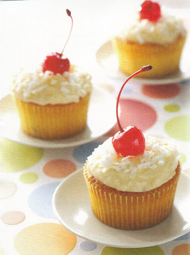 Frost cupcakes, sprinkle with coconut. Garnish with cherries.