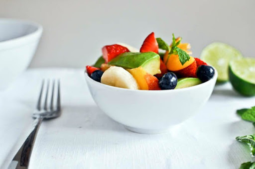 In a large bowl, combine lime juice with honey, salt and a bit of chopped mint leaves. Whisk to combine. Add in strawberries, blueberries and peaches. You can make the salad ahead of time before serving and set it in the fridge at this point. Right before serving, chop bananas and avocado, add to salad, and toss to coat in the lime juice mixture. Garnish with additional fresh mint.