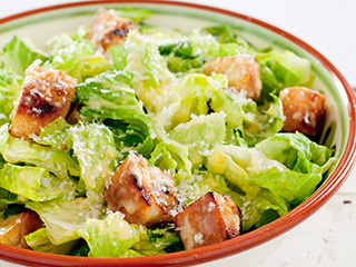 A combination of extra-virgin olive oil and canola oil gave our Caesar Salad dressing a neutral base. We used a rasp-style grater to turn garlic into pulp, then steeped it in lemon juice. To get all of our recipe’s ingredients to emulsify, we beat the yolks, anchovies, and Worcestershire sauce into the lemon juice and garlic, then slowly whisked in the oil and half of the cheese. For our Caesar salad’s croutons, we used ciabatta. Sprinkling the bread cubes with a little water and salt preserved their moistness and ensured they were perfectly tender at the center and browned around the edges after we toasted them.