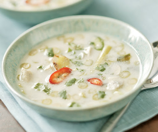 In a medium saucepan, commbine the coconut milk and broth. Bring to a gentle boil over medium-high heat. Stir in the galangal, lemongrass, and lime leaves. Add the chicken and mushrooms. Return to a gentle boil, reduce the heat, and simmer for 10 minutes to infuse the flavors and cook the chicken.