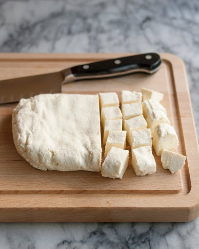 Press the curds: Transfer the curds (still in the cheesecloth) to a large dinner plate. Shape them into a rough square and then fold the cheesecloth tightly around the curds to form a neat rectangular package. Set a second plate on top of the package and weigh it down. Press for at least 15 minutes or up to 1 hour.
