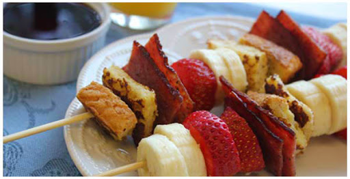 Fry Turkey Bacon in a large pan on medium heat for about 2 minutes on each side. Remove from pan and cut each slice into thirds. Set aside. Heat French Toast according to package instructions and cut each slice into nine 1 inch squares. Assemble 6 wooden skewers as follows… 2 French Toast squares, 2 Turkey Bacon slices, 2 Strawberry slices, 2 Banana slices. Repeat. Pour Maple Syrup into a small dish for dipping. Dunk away!