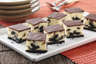 BAKE 45 min. or until center is almost set. Cool. Meanwhile, microwave chocolate and remaining butter in microwaveable bowl on HIGH 1 min.; stir until smooth. Cool slightly; spread over top of cheesecake. Refrigerate 4 hours. Use foil handles to lift cheesecake from pan before cutting to serve.