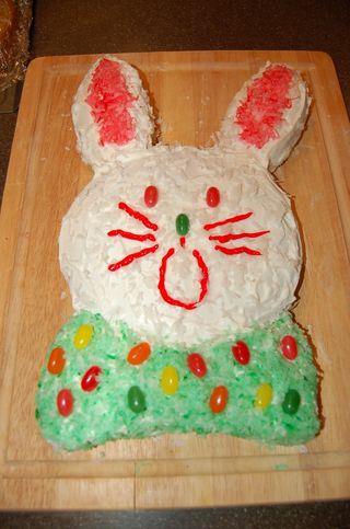 3. Assemble the bunny placing the ears at the top of one cake round and the bow tie at the bottom (as shown in the picture). Frost the entire bunny covering the top and sides. You can use a container of white frosting or make your own. Sprinkle with flaked coconut, if desired.