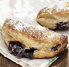 In a small bowl, beat the remaining egg yolk with 1 tsp. water. Brush the outer edge of each pastry round with the egg wash. Dollop 1/2 Tbs. of the cream cheese mixture in the center of each round. Top with 1 Tbs. of the blueberry mixture. Fold in half to form a half-moon shape and pinch the edges together to seal them. Lightly brush each pie with egg wash and sprinkle with 1/2 tsp. of the remaining sugar. With the tip of a paring knife, cut a steam vent in the center of each pie.