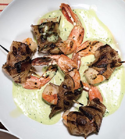 Grilled Pancetta-Wrapped Shrimp with Creamy Herb Dressing