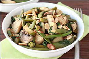 Add chicken, and season with salt and pepper. Add snap peas, asparagus, mushrooms, soy sauce, garlic, and ginger. Add 2 tablespoons water, and cook and stir until veggies are soft and chicken is cooked through, 7 - 9 minutes.