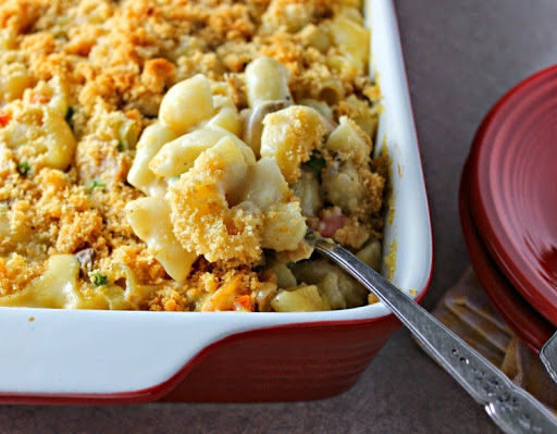 4. Assemble the casserole: Spray a 13" x 9" baking pan with cooking spray. Add the reserved cooked pasta and the reserved softened vegetables to the sauce. Stir to combine. Pour into prepared baking dish. Sprinkle with crushed crackers.