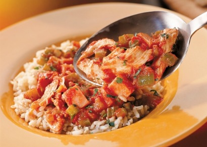 3.Add the rice and cook, stirring, for 2 minutes, or until it starts to brown. Stir in the chicken, tomatoes, broth, thyme, and pepper. Bring to a boil over high heat.