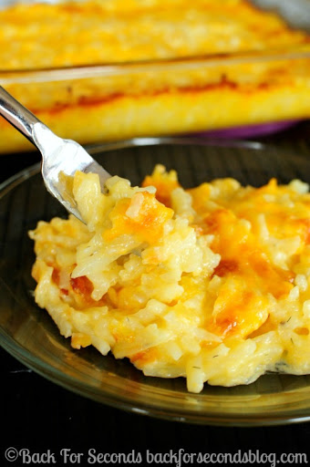 In a large bowl stir together everything except 1 cup of the cheese. Spread evenly into a greased 9x13" pan. Sprinkle the top with remaining cheese.